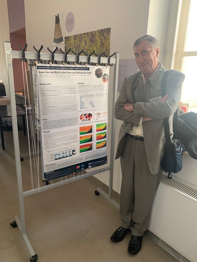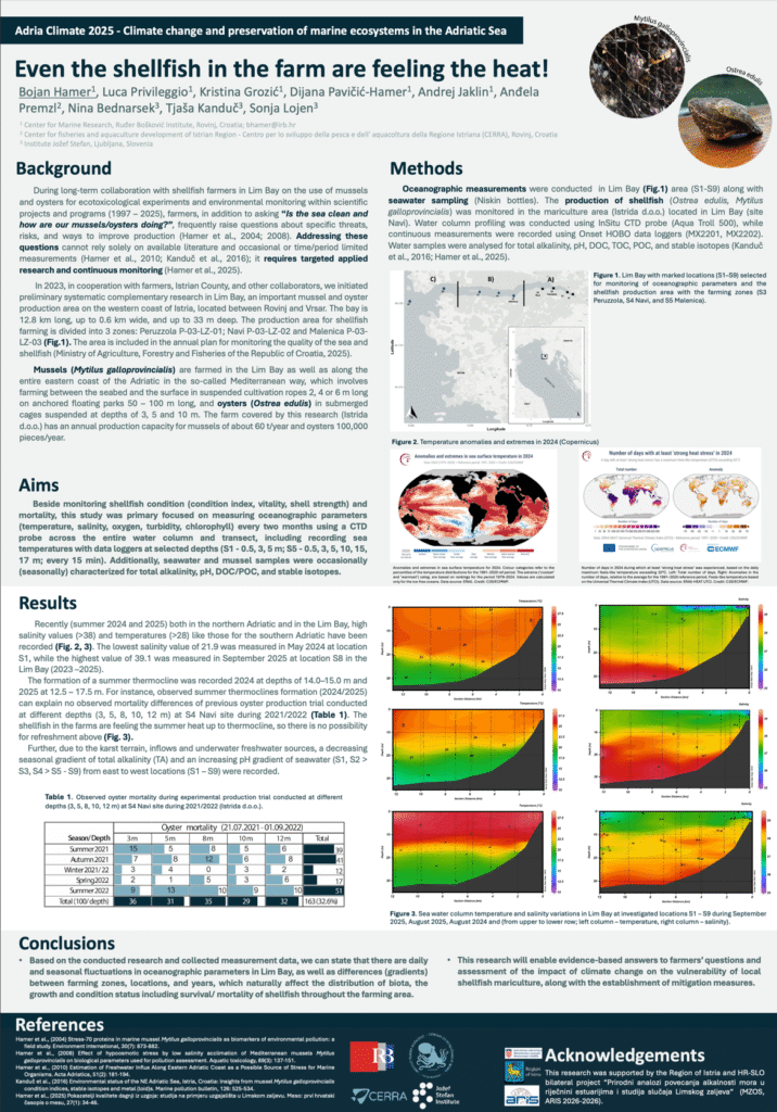 Dana 03. listopada 2025. godine znanstvenici Instituta Ruđer Bošković, Centra za istraživanje mora Rovinj (dr.sc. Bojan Hamer i asistent Luca Privileggio) prezentirali su na međunarodnom VI. znanstveno i stručnom skupu Adria Climate 2025 „Klimatske promjene i očuvanje morskih ekosustava Jadranskog mora“ Crikvenica, 2. – 5. listopada 2025. (https://adria-climate.hr/) rezultate regionalnih primijenjenih istraživanja i suradnje s uzgajivačima školjkaša na području Istarske županije.